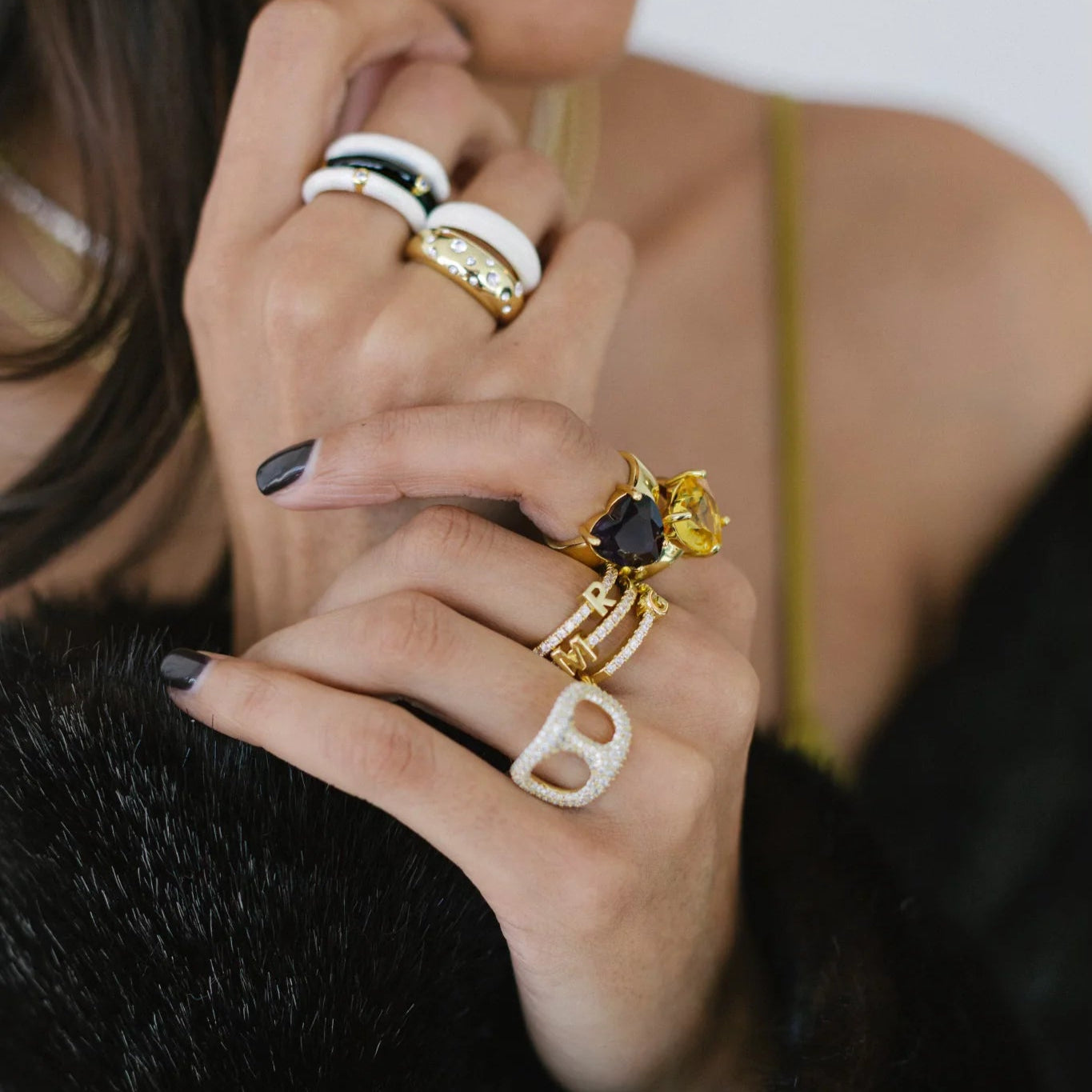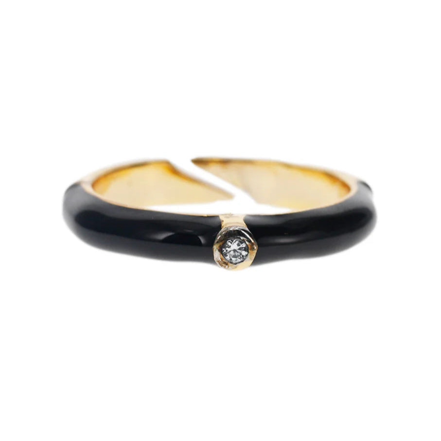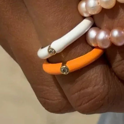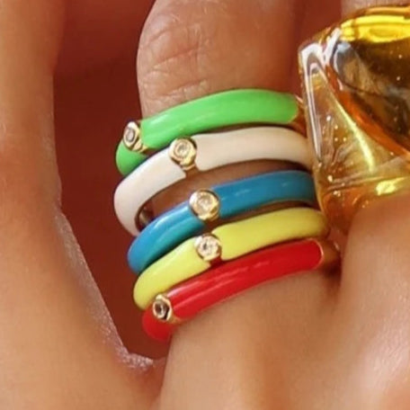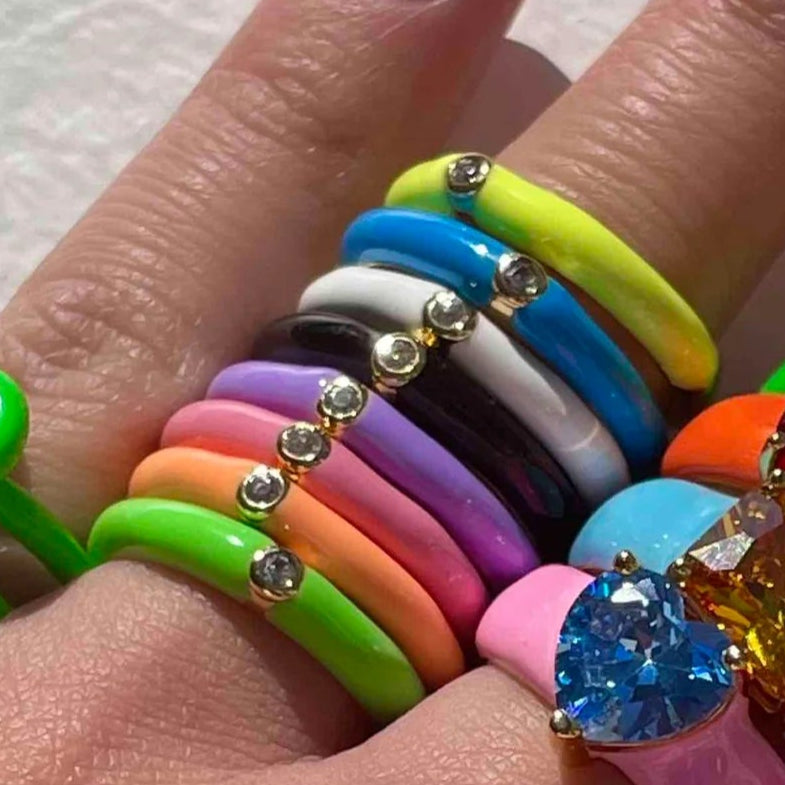 So bright, so light! The perfect stacking rings to go with our other rings. Thick coated enamel over gold-plated brass. Adjustable & comes in one size that fits anywhere from size US 5-9.